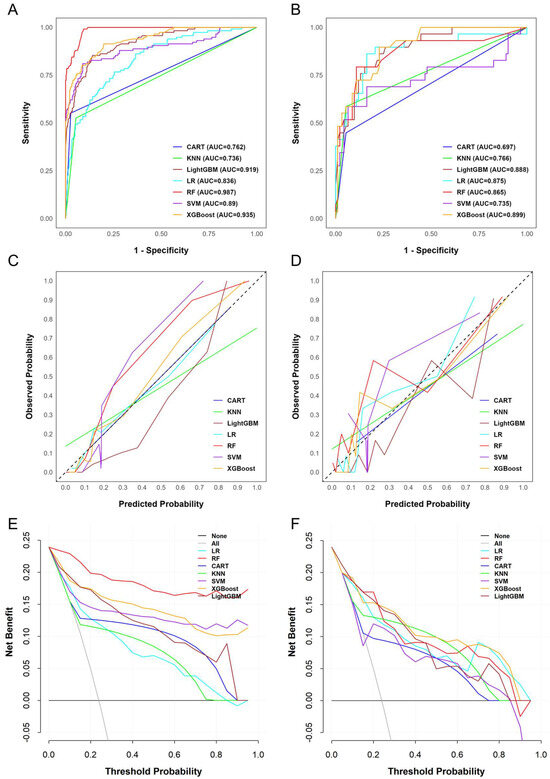 Machine learning models for predicting anti-drug antibody formation during infliximab induction. (A) Receiver operating characteristic (ROC) curve for the training set. (B) ROC curve for the validation set. (C) Calibration plot for the training set. (D) Calibration plot for the validation set. (E) Decision curve analysis (DCA) plot for the training set. (F) DCA plot for the validation set.