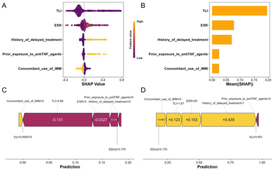 At the global level, summary plots (Figure 3A,B) demonstrate that TLI exerted the greatest influence on predictions, followed by ESR and history of delayed treatment. These features primarily drove model performance. TLI and ESR exhibited wide SHAP value distributions, reflecting their significant and varied impact across patients. In contrast, prior exposure to anti-TNF agents and concomitant use of IMM showed lower mean absolute SHAP values, indicating minimal overall influence. These observations correspond closely to the outcomes of the ablation analysis (Figure S2 and Table S5).