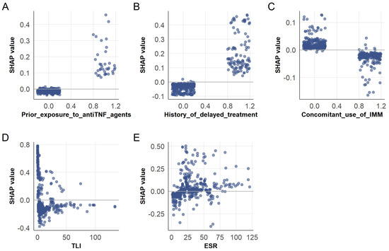 SHAP dependence plots (Figure 4) illustrate feature interactions with model outputs. Colored scatter points highlight nonlinear relationships and clinical thresholds. For binary features, including prior anti-TNF exposure (Figure 4A), history of delayed treatment (Figure 4B), and concomitant use of IMM (Figure 4C), SHAP values clustered near zero, with occasional positive spikes. This confirms their limited influence but suggests targeted utility in subgroups, such as increased monitoring for patients with prior anti-TNF exposure. Continuous features showed distinct patterns. TLI (Figure 4D) spanned a broad SHAP range, with lower values markedly increasing risk and higher values conferring protection. ESR (Figure 4E) exhibited a positive trend, with higher values linked to increased risk, reinforcing its role as an inflammation marker for identifying patients needing intensified immunosuppression.