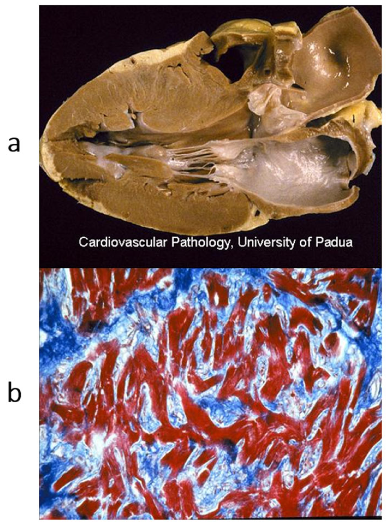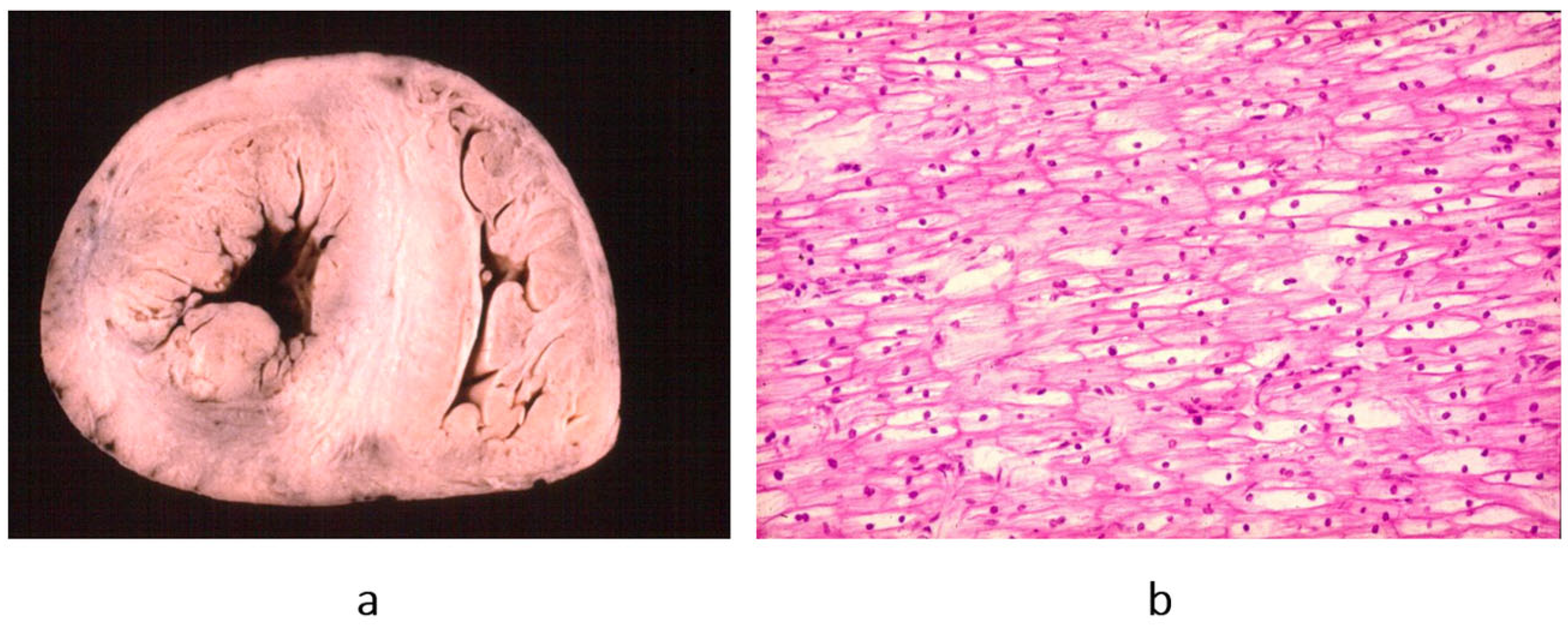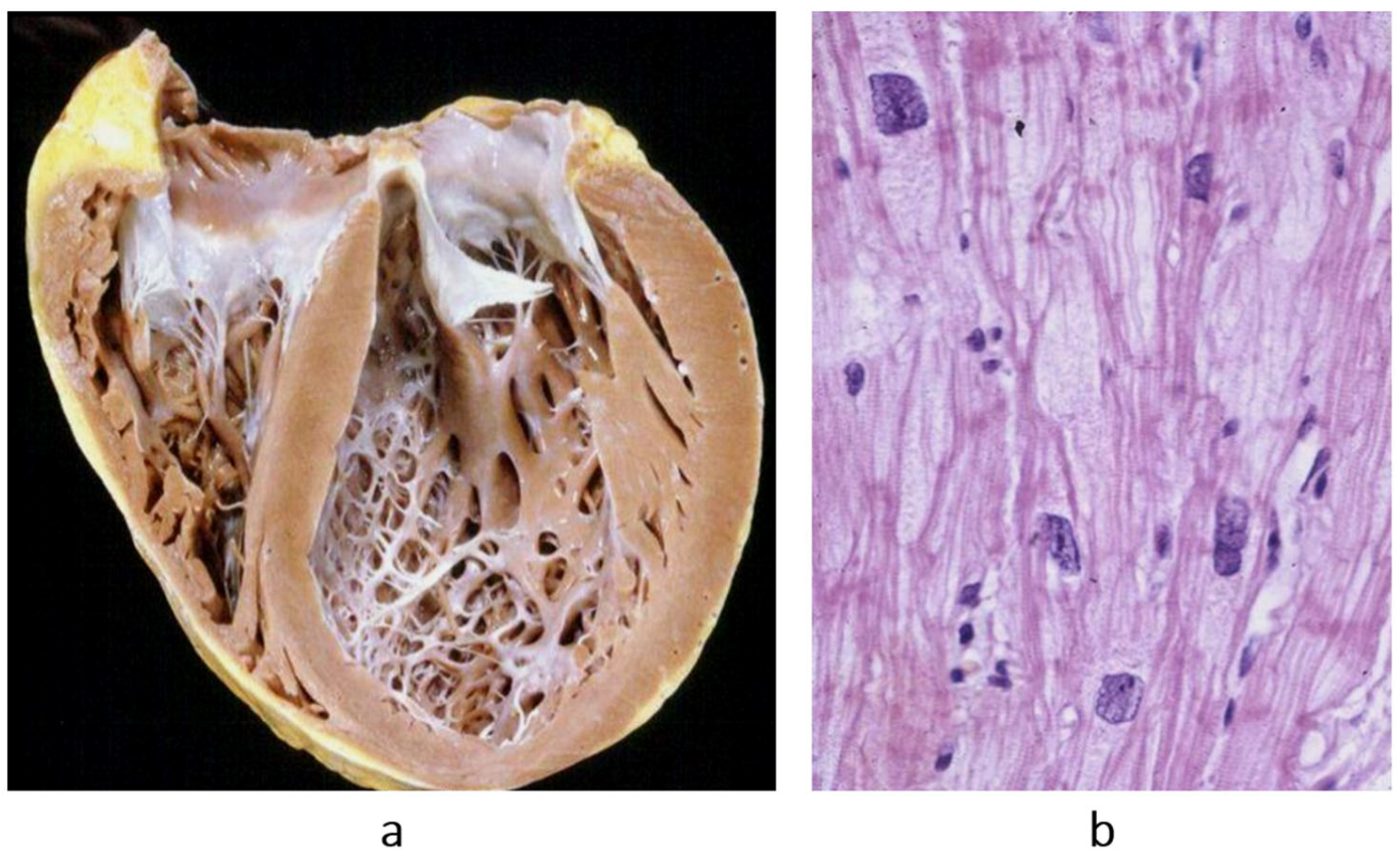 Figure 2b), it is characterized by asymmetric hypertrophy of the left ventricle, with myocardial disarray at histology (