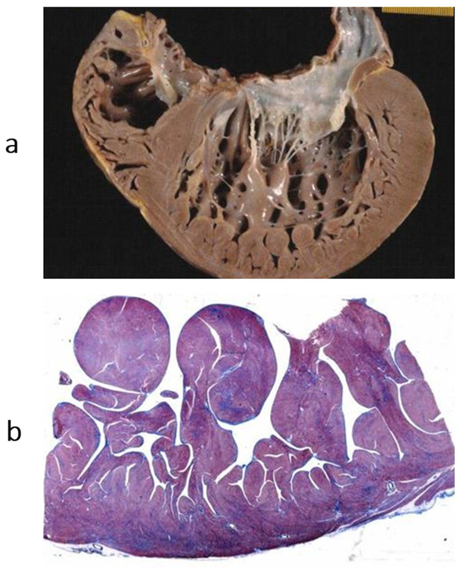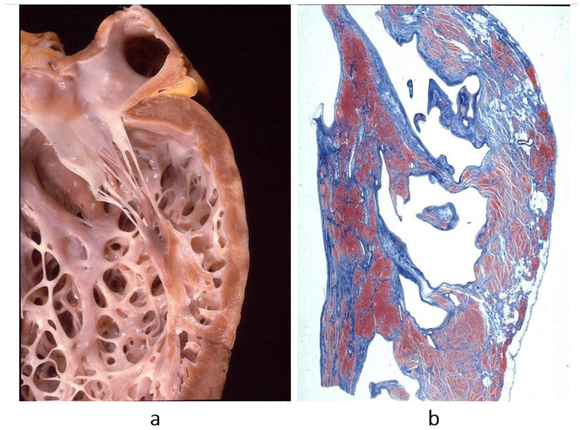 b) The histology of the trabeculae shows the endocardium almost touching the epicardium. The disease is a congenital heart disease because of embryological failure that occurred due to compacting myocardial trabeculae of the left ventricle. Haematoxylin–eosin stain. From [