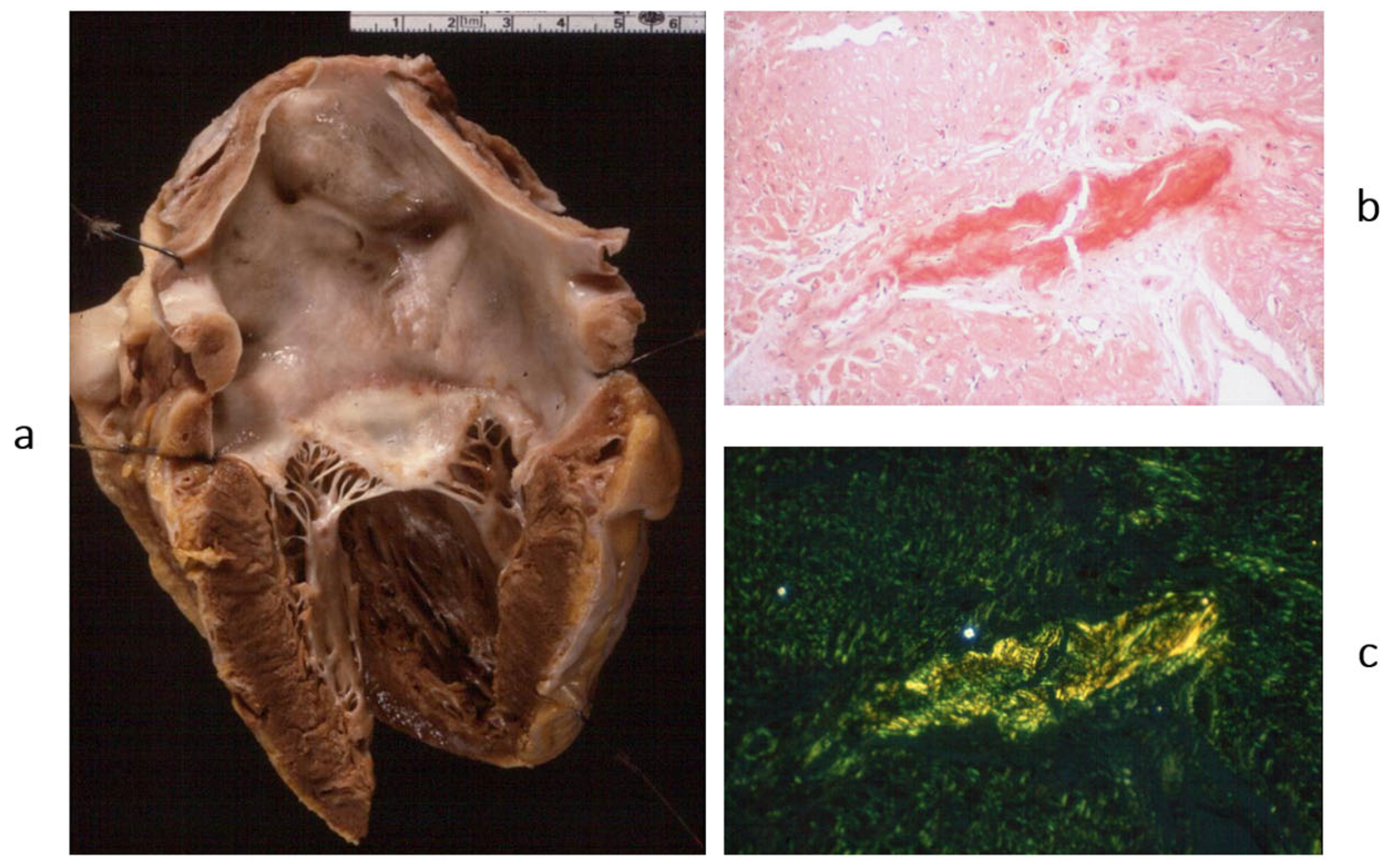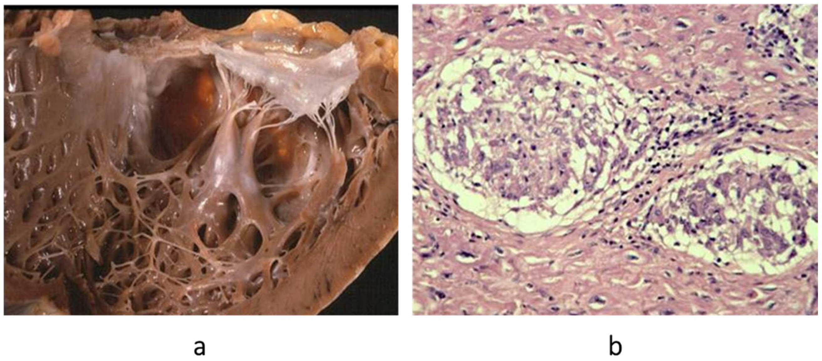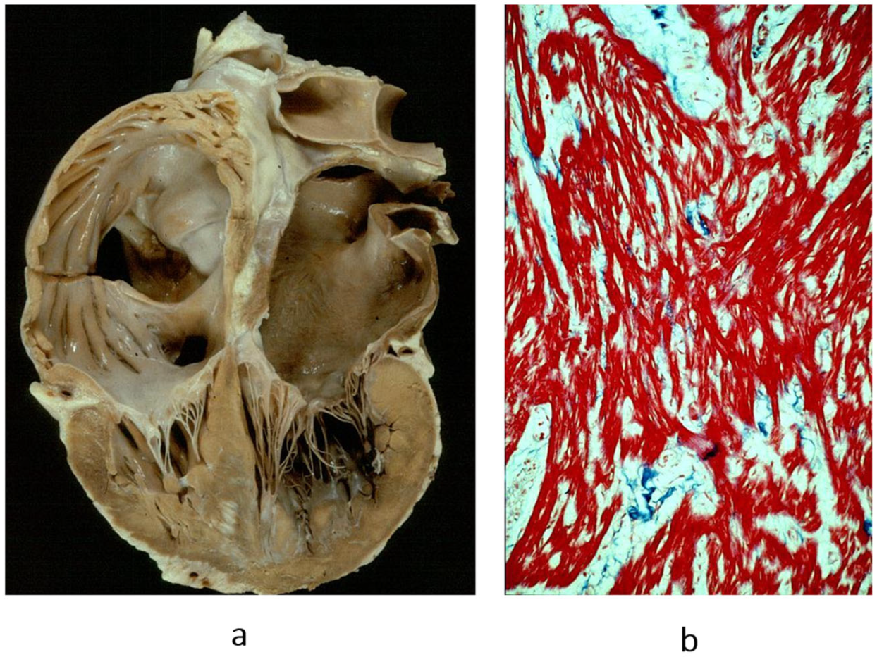 Restrictive cardiomyopathy (not obliterative). (a) Gross view of four-chamber section showing dilated atria. Note that the ventricular chambers do not exhibit obliteration. The hindered ventricular diastole-like appendages of the ventricles are due to stiff ventricular walls. (b) Histology show myocardial disarray, similar to that in hypertrophic cardiomyopathy. Azan Mallory stain.