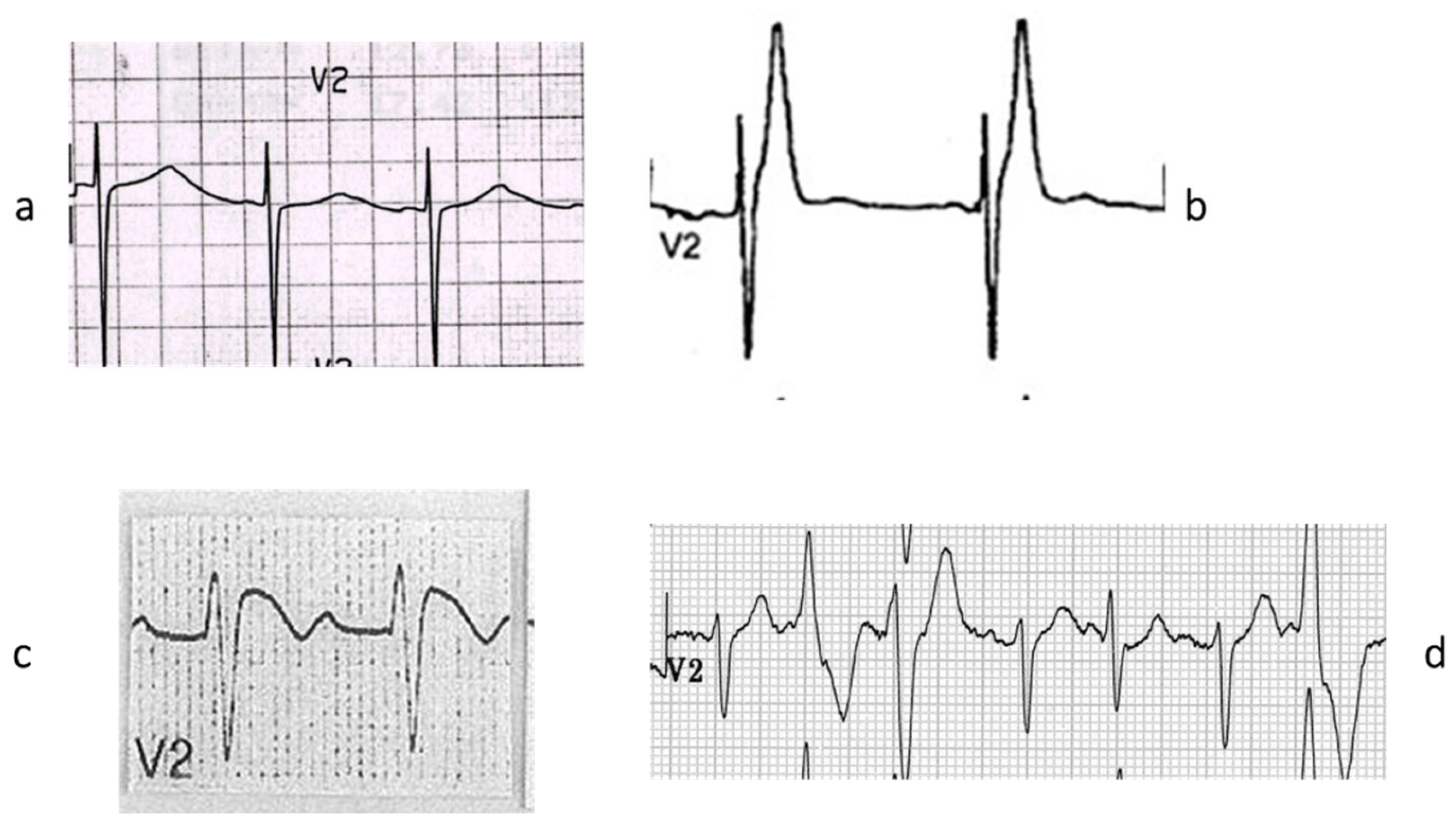 There are genetically determined cardiomyopathies without structural substrate and electrical dysfunction. This is the case of long QT (a) and short QT (b) interval and non-ischemic ST segment elevation in Brugada syndrome (c), called channelopathies of sodium, potassium, and polymorphic ventricular tachycardia caused by calcium ryanodinic receptor due to their electro-anatomic mechanical association (d) (personal archive).