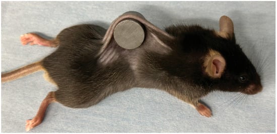 The mouse pressure injury model was established using previously reported methods [12,13,14]. Mice were subjected to isoflurane inhalation (for anesthesia) and dorsal hair removal. The dorsal skin was elevated and compressed between 2 circular ferrite magnetic disks (12 mm diameter, 5 mm thickness, magnetic force: 1180 G; NeoMag Co., Tokyo, Japan), to ensure inclusion of the dermis, epidermis, loose connective tissue, and subcutaneous fat, while sparing the muscle (Figure 1). The magnetic disks were removed after 12 h of dorsal skin trapping. Compression was applied without further anesthesia or immobilization. Each mouse developed 2 distinct ulcers that were separated by unaffected skin. For the time-course analysis of the ulcer area, photographs of the ulcers were taken from 5 mice per group (10 ulcers) and assessed using ImageJ (version 2.9.0/1.53t) [35]. The remaining animals (n = 8 ulcers in each group) were euthanized by carbon dioxide inhalation on day 3 after pressure injury for tissue collection. The tissue from the center of the ulcer was fixed using 4% paraformaldehyde (FUJIFILM Wako Pure Chemical Corp., Osaka, Japan) for histological staining and the tissue from the adjacent area was stored at –80 °C for subsequent experimental procedures. All evaluations were conducted by investigators who were blinded to group allocation (outcome assessor blinding).