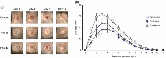 Ulcer formation was observed in all mice, and no mice were excluded from the analysis. At around day 3 after injury, the ulcers in all groups reached their maximal size, which then gradually decreased. By day 2, the pre-Si mice had significantly smaller ulcer areas (p < 0.05) than controls, and from day 6 onward, the post-Si group also exhibited significantly smaller ulcers than controls (Figure 2). In line with these findings, healing was accelerated in Si-treated mice. The mean healing times were 13.0 ± 0.2 days in controls, 11.8 ± 0.3 days in the pre-Si group, and 12.0 ± 0.3 days in the post-Si group, with both Si-treated groups healing significantly faster than controls (p < 0.05).