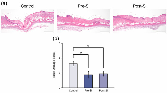 At day 3, control ulcer tissues exhibited deep necrosis of the epidermis and dermis with dense inflammatory cell infiltration, whereas pre-Si and post-Si mice showed milder tissue damage (Figure 3a). Quantitative scoring of HE sections confirmed significantly lower tissue damage scores (p < 0.05) in both Si-treated groups in comparison to controls (Figure 3b), suggesting that histological injury was attenuated by the Si-based agent.