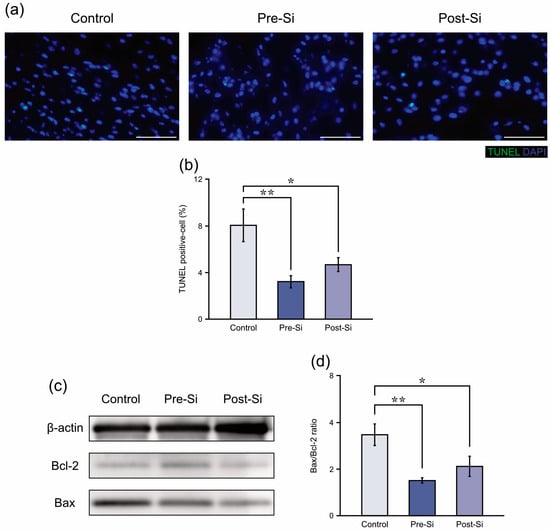 (a) Representative TUNEL-stained sections at day 3 for each experimental group of mice (scale bar = 50 μm). (b) Proportion (TUNEL-positive cells among DAPI-positive nuclei) for each experimental group of mice (** p < 0.01, * p < 0.05; mean ± standard error indicated by bars; Tukey’s Honestly Significant Difference test; n = 8). (c) Representative Western blot images for each experimental group. (d) Relative Bax/Bcl-2 ratio at day 3 for each experimental group of mice (** p < 0.01, * p < 0.05; mean ± standard error indicated by bars; Tukey’s Honestly Significant Difference test; n = 8).