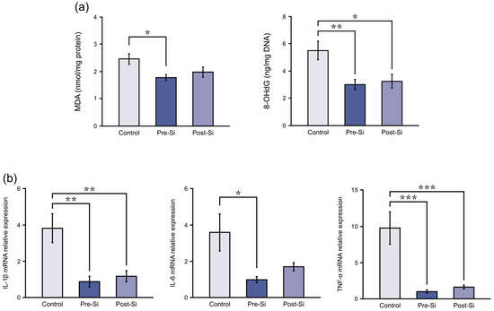 Markers of oxidative stress were reduced in Si-treated mice (Figure 5a). Mean MDA levels (nmol/mg protein) were 2.5 ± 0.2 in controls, 1.8 ± 0.1 in pre-Si mice, and 2.0 ± 0.2 in post-Si mice, with the pre-Si group showing significantly lower levels than controls (p < 0.05). Mean 8-OHdG levels (ng/mg DNA) were 5.5 ± 0.7 in controls, 3.0 ± 0.4 in pre-Si mice, and 3.3 ± 0.5 in post-Si mice. Both Si-treated groups showed significantly reduced 8-OHdG levels compared with controls (p < 0.05).