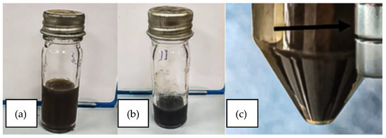 (a) Aqueous suspension of synthesized iron oxide nanoparticles (IONPs) exhibiting a brownish coloration, indicative of nanoparticle formation. (b) Andrographolide-functionalized IONPs (AG-IONPs) displaying a visible color shift compared to bare IONPs, confirming surface modification with andrographolide. (c) Magnetic attraction of IONPs toward an external permanent magnet, demonstrating their superparamagnetic behavior and suitability for magnetically guided drug delivery applications.
