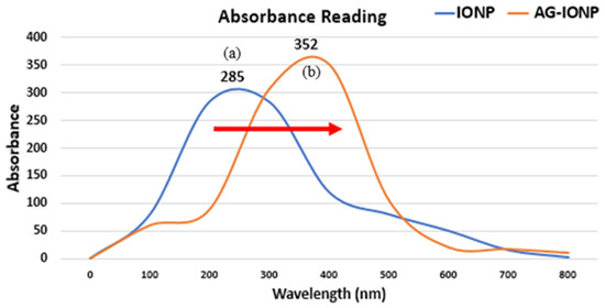 UV–visible absorbance spectra of iron oxide nanoparticles (IONPs) and andrographolide-loaded iron oxide nanoparticles (AG-IONPs). IONPs exhibited a distinct absorption peak at 285 nm (a), while AG-IONPs showed a red-shifted peak at 352 nm (b).