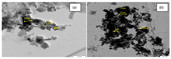 Transmission electron microscopy (TEM) images of (a) iron oxide nanoparticles (IONPs) and (b) andrographolide-loaded iron oxide nanoparticles (AG-IONPs). IONPs appeared as nearly spherical particles with uniform morphology, whereas AG-IONPs exhibited slightly larger sizes following surface functionalization with andrographolide.