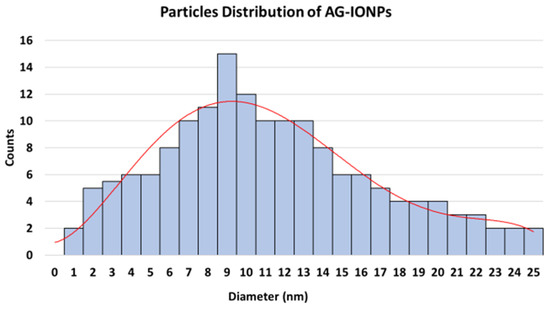 Particle size distribution of andrographolide-loaded iron oxide nanoparticles (AG-IONPs) obtained from transmission electron microscopy (TEM) image analysis.