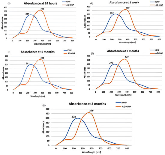 The colloidal stability of IONPs and AG-IONPs was assessed by monitoring UV–Vis absorbance peaks (285 nm for IONPs and 352 nm for AG-IONPs) at defined storage intervals (24 h, 1 week, 1 month, 2 months, and 3 months) at 4 °C.