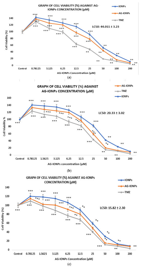 DBTRG-05MG human glioblastoma cells (CRL-2020, ATCC, Manassas, VA, USA) were maintained in RPMI-1640 medium supplemented with 10% fetal bovine serum (FBS) and 1% penicillin–streptomycin at 37 °C in a humidified incubator containing 5% CO2. For cytotoxicity analysis, cells were seeded at a density of 5000 cells/well in 96-well plates and incubated overnight. AG-IONPs or temozolomide (TMZ) were added at concentrations ranging from 0.7813 μM to 200 μM, and cells were incubated for 24, 48, or 72 h. WST-1 reagent (10 μL) was then added to each well and incubated for 45 min. Absorbance was measured at 430 nm with a reference wavelength of 630 nm using a microplate reader (SpectraMax, San Jose, CA, USA).