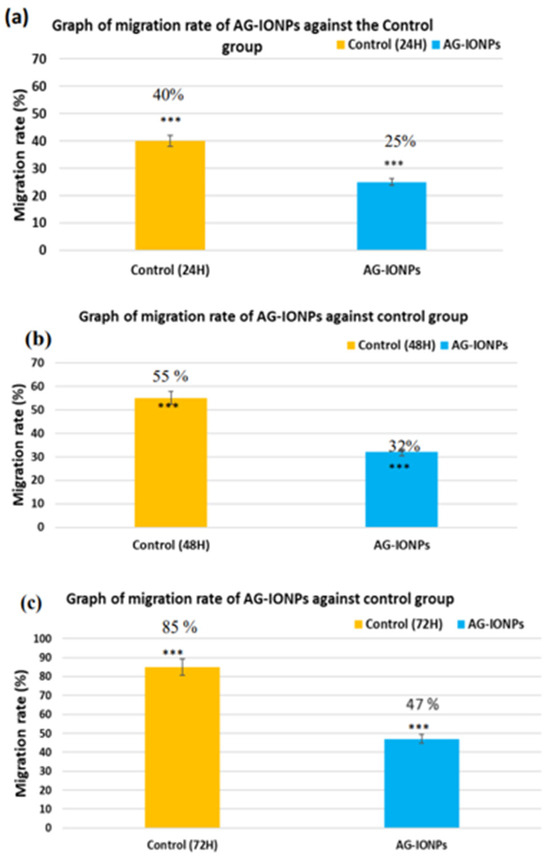 Scratch-wound assay showing the migration rate of DBTRG-05MG glioblastoma cells treated with andrographolide-loaded iron oxide nanoparticles (AG-IONPs) compared with untreated controls. Cells were exposed to 15.82 μM AG-IONPs (LC50 concentration) or complete medium alone for 24, 48, and 72 h. Data are presented as mean ± standard deviation (SD). Statistical analysis was performed using one-way ANOVA followed by Tukey’s post hoc test; *** p < 0.001 versus control.