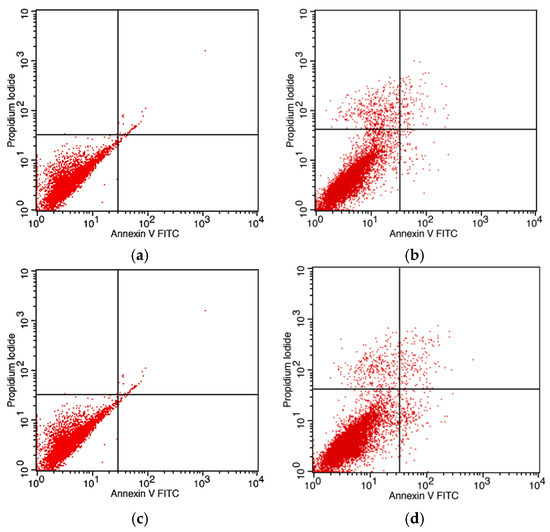 Apoptosis was evaluated in DBTRG-05MG glioblastoma cells following treatment with bare IONPs and AG-IONPs for 24 h and 48 h using Annexin V-FITC/PI staining and flow cytometry. Cells treated with bare IONPs (Figure 11a,c) showed negligible apoptosis, with most events clustering in the viable cell quadrant. In contrast, AG-IONPs (Figure 11b,d) induced a marked increase in both early and late apoptotic populations compared with untreated controls. The effect was time-dependent, with apoptosis more pronounced at 48 h than at 24 h, demonstrating that AG conjugation significantly enhances the pro-apoptotic activity of IONPs.