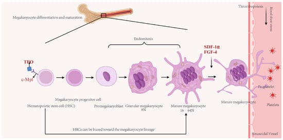 Platelets play important roles in physiological and pathological processes, such as hemostasis, thrombosis, inflammation, and tumor metastasis [40]. These enucleated cell fragments are derived from MKs, with each MK capable of producing approximately 1000 to 3000 platelets. The production of platelets can be conceptually divided into two distinct stages. The initial stage involves the maturation of MKs. According to the classical model of megakaryopoiesis, hematopoietic stem cells (HSCs), which are located in the osteoblastic niche—a proliferative microenvironment within the bone marrow (BM)—differentiate into MK-erythroid progenitor cells, which subsequently evolve into distinct MK progenitor cells [41]. Under regulation by chemokines, growth factors (primarily thrombopoietin), stromal cells, and other regulatory factors, MK progenitor cells differentiate into mature MKs (stage III MKs) through two intermediary stages: megakaryoblasts (stage I MKs) and promegakaryocytes (stage II MKs), thereby preparing for platelet production [42]. Furthermore, recent studies have proposed an alternative model suggesting the presence of MK/platelet-biased HSCs within the HSC population [43,44,45]. During the process of MK maturation, these cells undergo significant enlargement accompanied by extensive nuclear proliferation and the biosynthesis of platelet-specific granules. Additionally, MKs expand their cytoplasmic contents and develop a demarcation membrane system (DMS) to facilitate the formation of the plasma membranes necessary for platelet production [46]. The subsequent stage encompasses proplatelet formation and platelet release, which occur within several hours. Under regulation by stromal cell-derived factor 1-α (SDF-1α) signaling, mature MKs (ranging from 8 to 64 N ploidy) migrate from the BM niche to the capillary-rich vascular niche and the lung microcirculation, where they extend their cytoplasm to form branched structures known as proplatelets [47,48]. Under conditions of shear and turbulent flow, platelets are subsequently released from these proplatelets into the circulation [49]. Figure 1 shows a schematic of the process of MK maturation, polyploidization, and platelet production.
