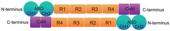 α-Actinin-1 is a cytoskeletal protein belonging to the spectrin superfamily of actin-binding proteins [32,73]. Among the four identified α-actinin isoforms, α-actinin-1 is categorized as a nonmuscle isoform because of its extensive expression in nonmuscle cells and its sensitivity to calcium. Structurally, α-actinin-1 has a conserved domain architecture characteristic of all α-actinin isoforms: it possesses an N-terminal actin-binding domain (ABD) comprising two calponin homology (CH) domains (CH1 and CH2), a connecting segment (neck), a central rod domain composed of four spectrin repeats (SR1–SR4) that facilitate antiparallel dimerization, and a C-terminal calmodulin-like (CaM) domain containing E-helix and F-helix (EF)-hand motifs (Figure 2). The protein functions as an antiparallel homodimer, enabling it to crosslink actin filaments at both ends, thereby contributing to the organization and stability of the actin cytoskeleton. The actin-binding domain (ABD) region encompasses at least three primary actin-binding sites (ABSs) and facilitates the cross-linking of actin filaments at a 1:10 ratio within bundles [74,75]. Additionally, the ABD region can engage in direct or indirect interactions with integrins. Specifically, the ABD of α-actinin-1 is crucial for F-actin binding, with significant actin-binding sites located within the CH1 domain and the linker region between CH1 and CH2. The central rod domain plays a role in dimerization and imparts structural stability, whereas the CaM domain modulates actin-binding activity in a calcium-dependent fashion. The CaMD region comprises four EF-hand motifs (EF1/2 and EF3/4) [32,76], which have the capacity to bind calcium ions. In nonmuscle isoforms, such as α-actinin-1, the binding of calcium induces conformational changes that influence the efficiency of actin crosslinking.