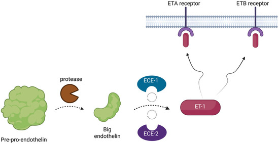 The three genes initially encode a larger peptide, known as pre-pro-endothelin. This precursor is biologically inert, but it is quickly activated by proteases. At first, the pre-pro-endothelin is cleaved by the enzymes into another smaller peptide, known as big-endothelin, another inactive precursor. Afterwards, this precursor is once more converted by two membrane-bound metalloproteases, known as endothelin-converting enzymes 1 and 2 (ECE1 and ECE2), into its final form and it is released into the interstitial space and in smaller concentrations into the circulation [4,5,6] (see Figure 1).