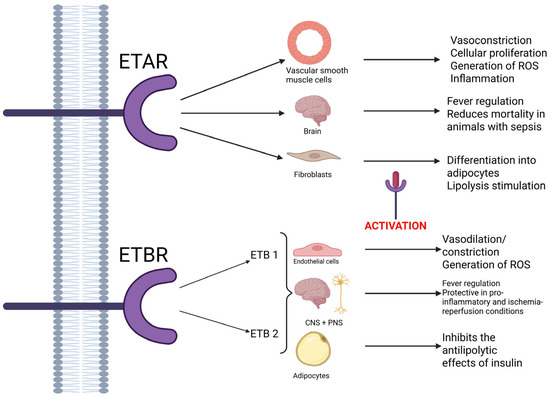 In contrast, ETB receptors are nonselective and bind to all isoforms of endothelin with equal affinity [5]. Two subtypes of receptors have been identified: ETB1, which are expressed on endothelial cells and play a part in vasodilation mediated by nitric oxide, and ETB2, which are predominantly involved in contraction. Both these subtypes, along with ETA receptors, are involved in the generation of reactive oxygen species. In the central nervous system, ETB receptors are also known to be involved in the appearance of fever, while stimulation of ETB1 receptors provides tissue protection in proinflammatory and ischemia–reperfusion conditions in the peripheral and central nervous system. Furthermore, some authors have pointed out the fact that ETB receptors could be connected to the clearance of ET-1 [2,4,5]. Also, in adipocytes, ETB receptors seem to inhibit the antilipolytic effects of insulin, once activated. As such, the effects of ET-1 depend on the type of activated receptor [6]. A schematic of all these effects is available in Figure 2, listed below.