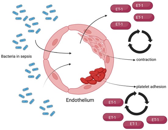 Physiologically, endothelial cells play an important role in infections, in order to limit the dissemination of the systemic response, control leukocyte recruitment, and facilitate bacterial elimination. In sepsis, the regulation of endothelins (especially ET-1) is one of the first systems affected, leading to modifications in blood flow (through systemic vascular dilation, which does not respond to pressor medication), perfusion, and capillary permeability. High levels of this peptide have been identified in acute heart, kidney, lung, and liver injury (especially during sepsis), as well as septic shock, promoting inflammation inside vascular walls through increased vascular permeability, cytokine release, and leukocyte migration. Therefore, during sepsis, an impairment of the vascular tone due to the dysregulated production of vascular permeability, cytokine release, and leukocyte migration can be observed. Also, these massive inflammatory and oxidative stress responses, combined with endothelial damage, microvascular dysfunction, and hypoxemia, lead to sepsis-induced organ failure [2,10,11].