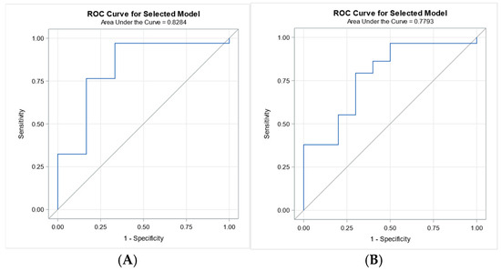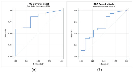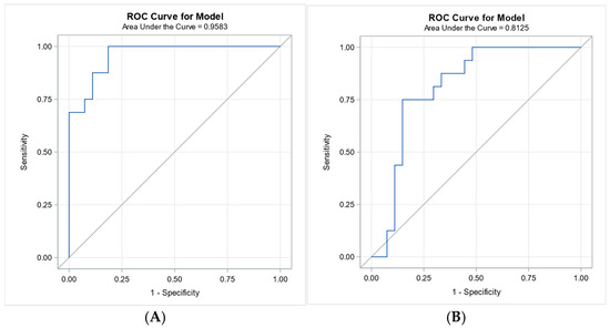 Receiver operating characteristic (ROC) curves for CRP and PCT in distinguishing sepsis/septic shock from SIRS. Legend: Panel (A): ROC curve for C-reactive protein (CRP) with an area under the curve (AUC) of 0.9583, indicating excellent discriminative ability. Panel (B): ROC curve for procalcitonin (PCT) with an AUC of 0.8125, demonstrating good discriminative performance. Both biomarkers were identified as top predictors by logistic regression analysis.