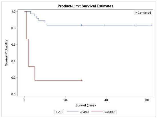 Kaplan–Meier survival curves stratified by IL-10 serum levels (pg/mL). Legend: Kaplan–Meier survival analysis comparing patients with IL-10 levels < 843.6 pg/mL (blue curve) and ≥843.6 pg/mL (red curve). The x-axis represents survival time in days; the y-axis shows survival probability. “+” symbols indicate censored observations. Patients with higher IL-10 levels (≥843.6 pg/mL) demonstrated significantly improved survival.
