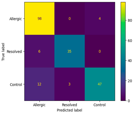 The confusion matrix in Figure 3 demonstrates the ANN algorithm’s performance on DMP feature selection, showing strong classification accuracy with 95 correctly identified Allergic cases and 27 correctly classified Resolved instances. The primary misclassification pattern involves 12 Resolved cases incorrectly predicted as Allergic, while only 1 Allergic case was misclassified as Resolved. Additional cross-class errors include 9 Control cases misclassified as Allergic and 2 as Resolved, indicating that the algorithm occasionally confuses resolved and control states with active allergic conditions, likely reflecting the complex biological similarities between these transitional states.