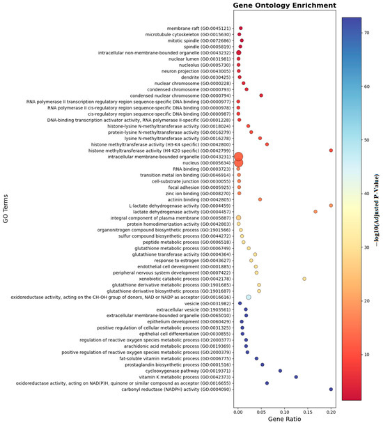As shown in Figure 6, gene ontology enrichment analysis demonstrates that genes with differential methylation patterns are predominantly enriched in immune response and inflammatory processes. The analysis reveals significant functional clustering in membrane organization, transcriptional regulation, and metabolic pathways relevant to food allergy pathogenesis. Cellular component categories show highest enrichment in membrane raft (GO:0045121) and microtubule cytoskeleton (GO:0015630), indicating epigenetic targeting of critical immune cell signaling platforms. Molecular function analysis highlights RNA polymerase II transcription regulatory region sequence-specific DNA binding (GO:0000977) and histone methyltransferase activities, suggesting coordinated DNA methylation and histone modifications in allergic responses. Notably, pathways such as TNF signaling, vitamin D biosynthesis, lactate dehydrogenase activity, and necroptotic signaling were enriched, indicating that both immune regulation and metabolic mechanisms play crucial epigenetic roles in food allergy pathogenesis. The enrichment of extracellular vesicle categories and oxidoreductase activities further suggests that intercellular communication and oxidative stress responses are subject to epigenetic control, providing a molecular framework for understanding how differential methylation coordinates immune activation and metabolic adaptation in allergic responses to food antigens.