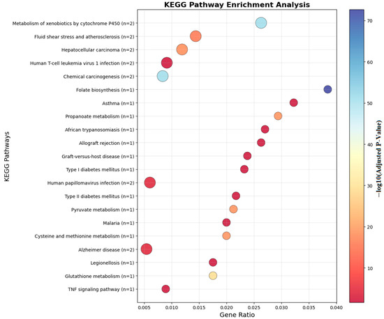 Figure 7 illustrates the KEGG pathway enrichment of differentially methylated genes identified in food allergy. The analysis highlights several immune-related pathways, including the NF-κB signaling pathway, TNF signaling pathway, and RIG-I-like receptor signaling pathway, which are central to inflammatory and allergic responses. Additionally, metabolic and pharmacological pathways, such as the adipocytokine signaling pathway and antifolate resistance, were enriched. These findings suggest that DNA methylation changes not only influence immune regulation but may also affect metabolic and signaling processes relevant to food allergy pathogenesis.