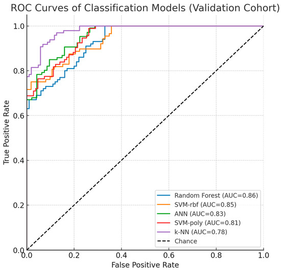 As shown in Figure 9, the ROC curves of the classification models in the validation dataset (GSE114135) demonstrated consistent performance with the discovery cohort. Random Forest and SVM-rbf achieved the highest AUC values, while ANN, SVM-poly, and k-NN also maintained reproducibility. These results reinforce the robustness of LDHC and SLC35G2 as potential epigenetic biomarkers for food allergy.