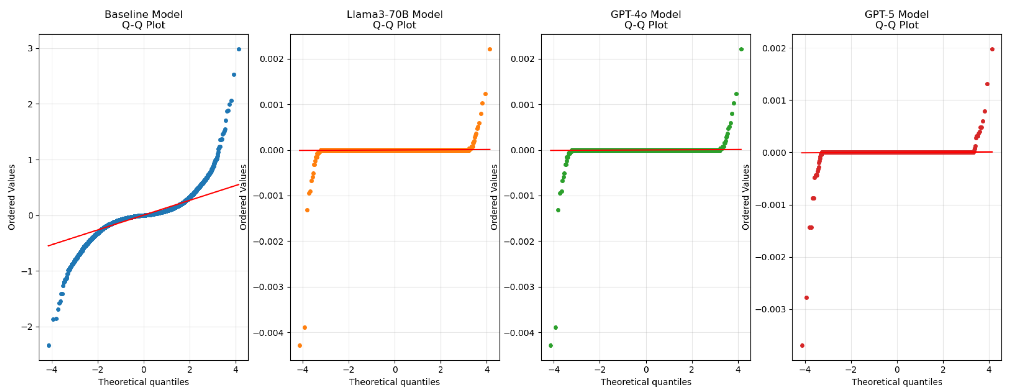 Figure 4 presents the updated Q–Q (quantile–quantile) plot for the residuals of the evaluated models. The Q–Q plot shows how closely residuals follow a normal distribution: points lying near the diagonal indicate good agreement. The embedding-based approaches (Llama3-70B, GPT-4o, and GPT-5) exhibit tighter adherence to the diagonal than the baseline RF, with GPT-5 showing the closest fit and the smallest deviations. These observations indicate that the embedding models, especially GPT-5, produce more consistent residuals and that there is no strong systematic bias in the predictions [