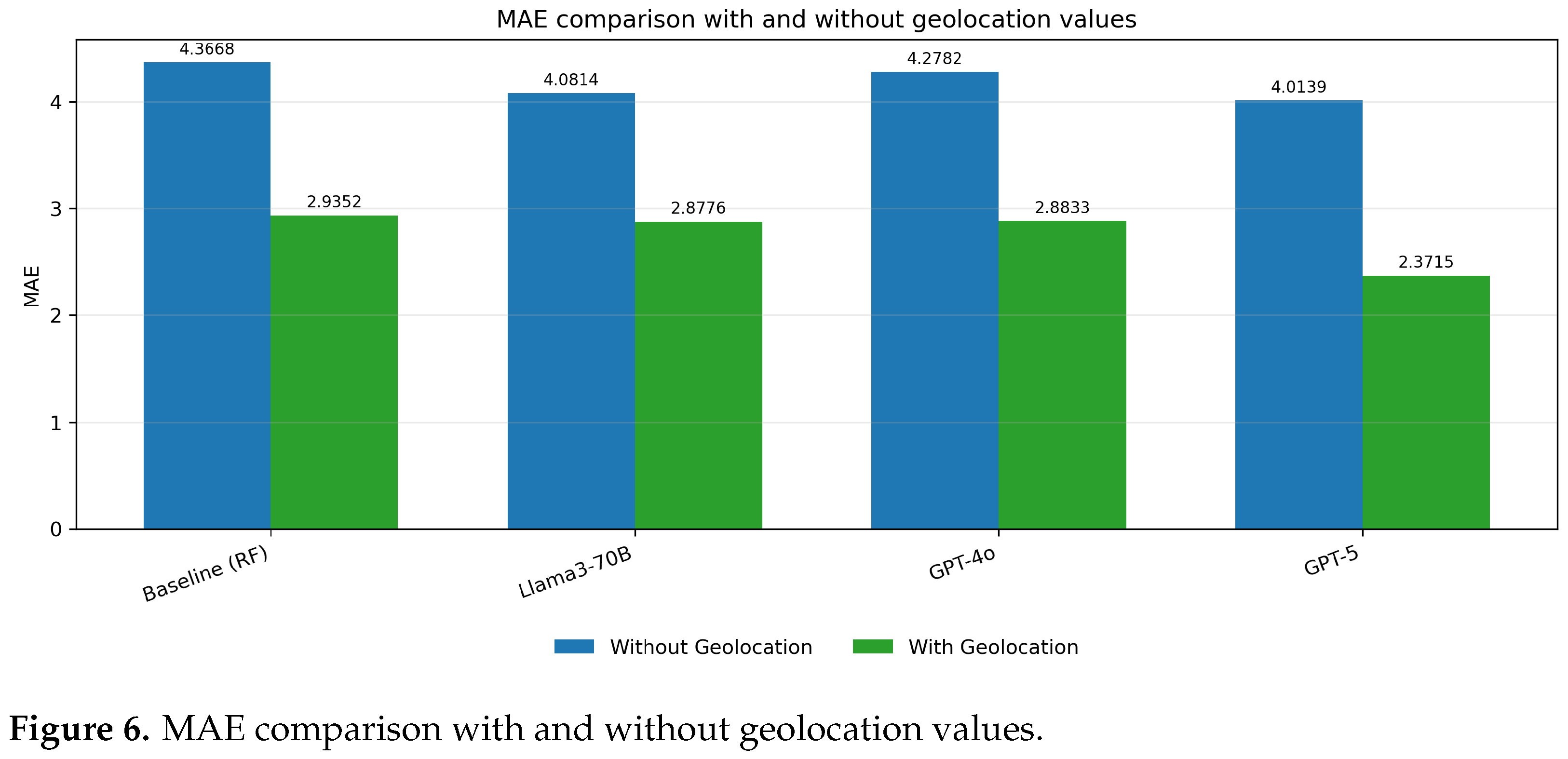 Figure 5). Similarly, the MAE values are notably smaller with geolocation, reflecting improved accuracy in predictions. (