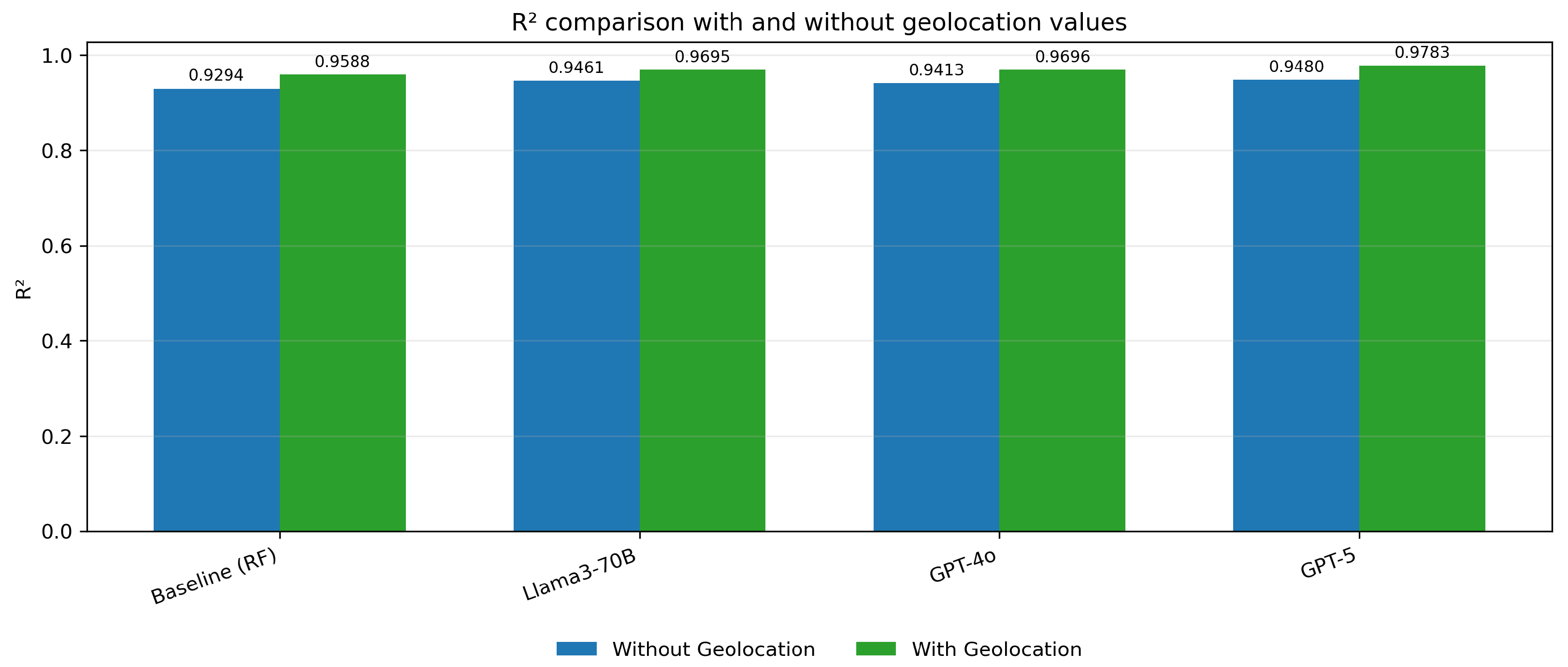 GPT-5 + RandomForestRegressor. GPT-5 (with geolocation) achieved the best overall results, an MSE = 14.0339, an MAE = 2.3715 and an R2 = 0.9783, indicating the strongest fit and lowest prediction error among the evaluated models.