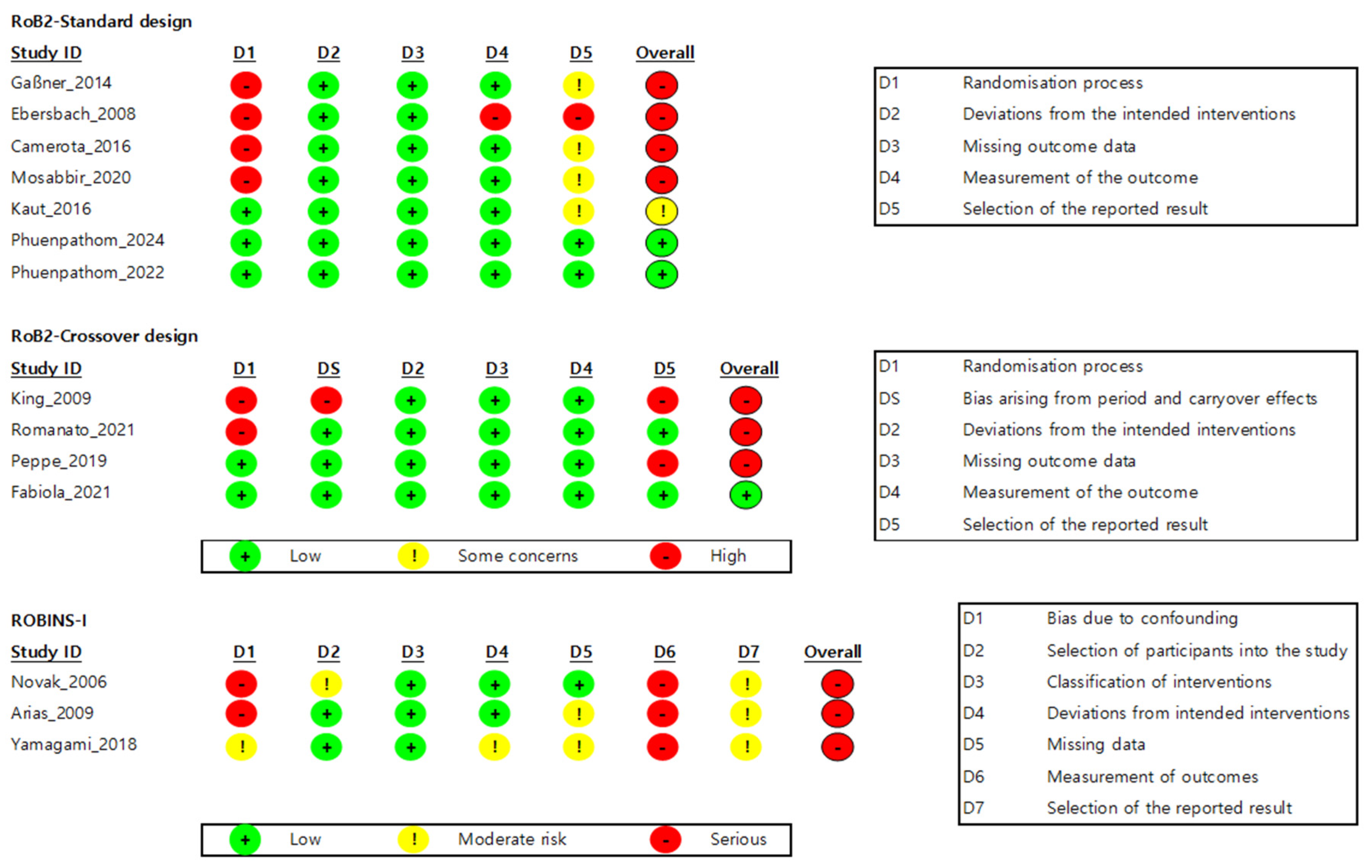 - Higgins, J.P.; Savović, J.; Page, M.J.; Elbers, R.G.; Sterne, J.A. Assessing risk of bias in a randomized trial. In Cochrane Handbook for Systematic Reviews of Interventions, 2nd ed.; Higgins, J., Thomas, J., Chandler, J., Cumpston, M., Li, T., Page, M., Welch, V., Eds.; John Wiley & Sons: Chichester, UK, 2019; pp. 205–228. [Google Scholar]