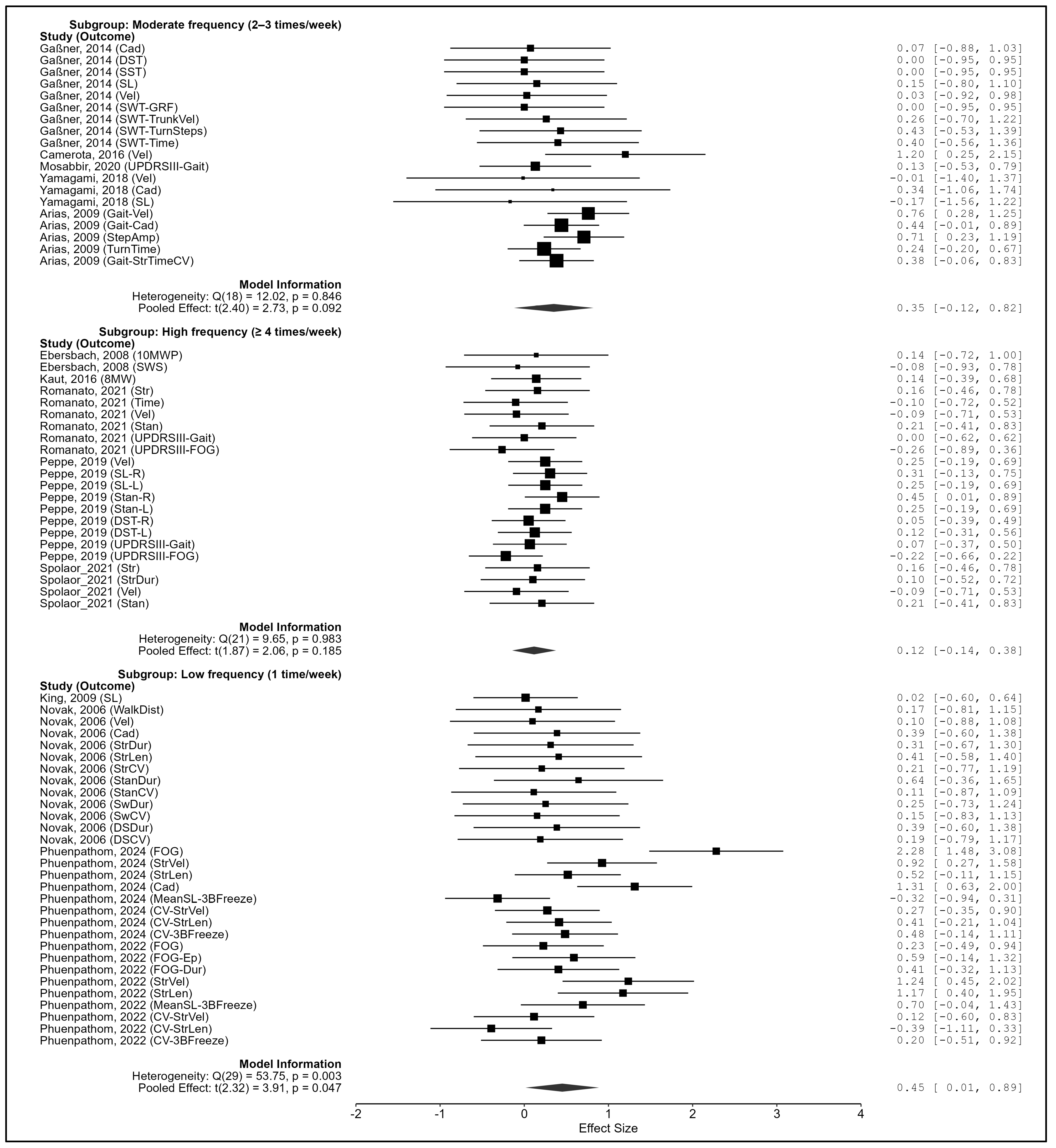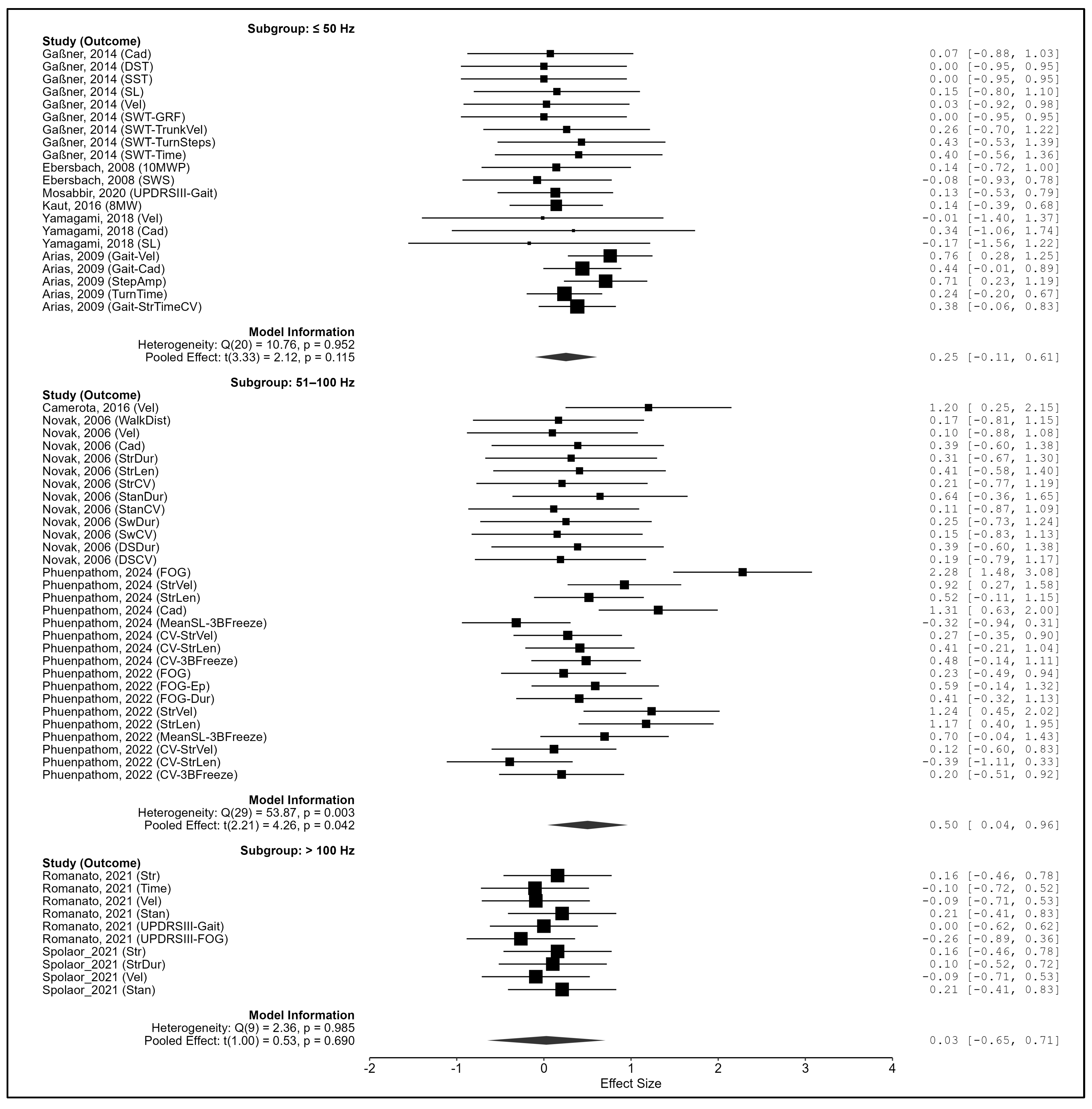 Frequency (Hz) | ≤50 Hz | 0.253 | [−0.106, 0.613] | [−0.319, 0.826] | Qm(2) = 14.66, <0.001 ** |