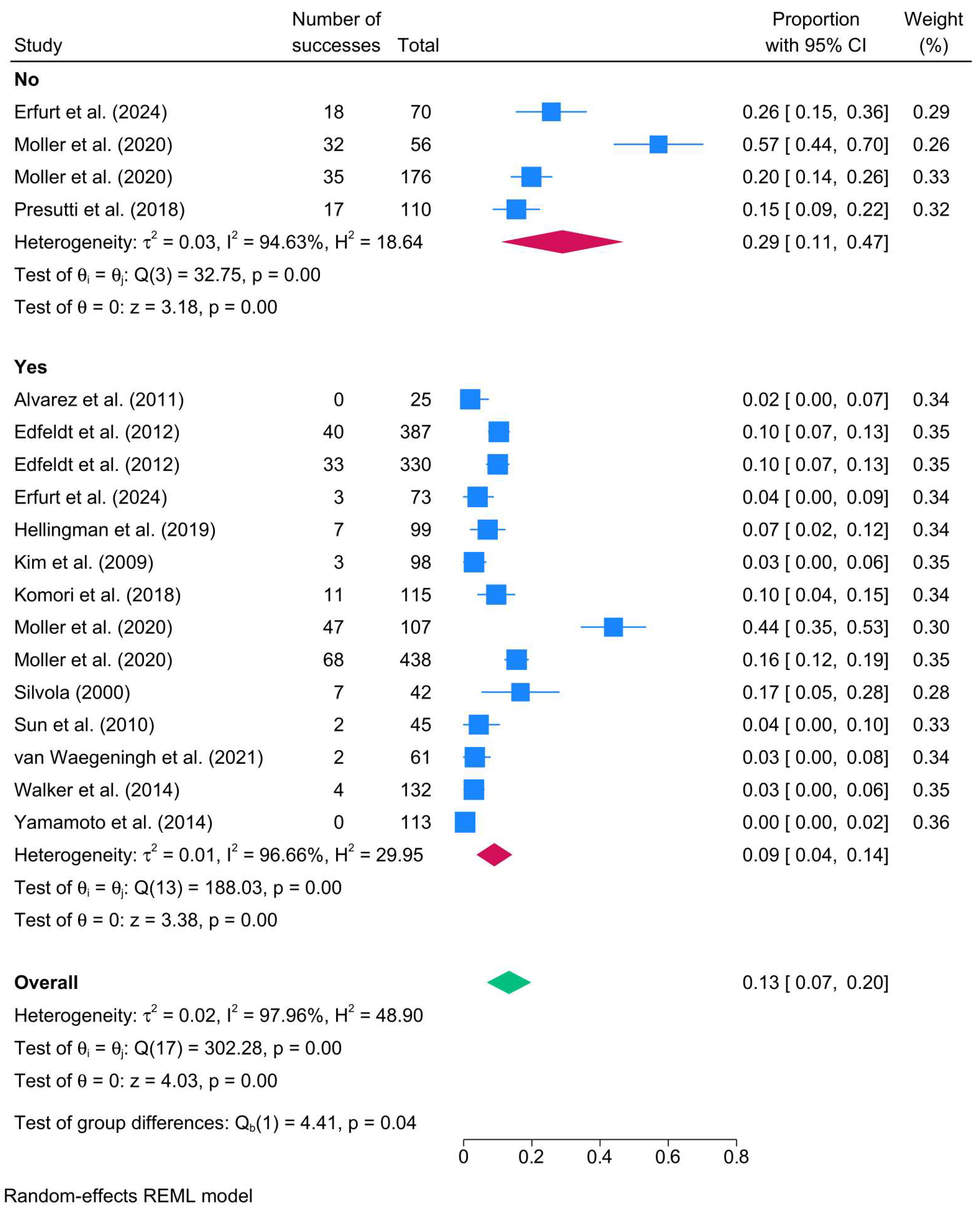 Single-stage surgery | 11 | 8% | 4–13% | 91.41% | |
