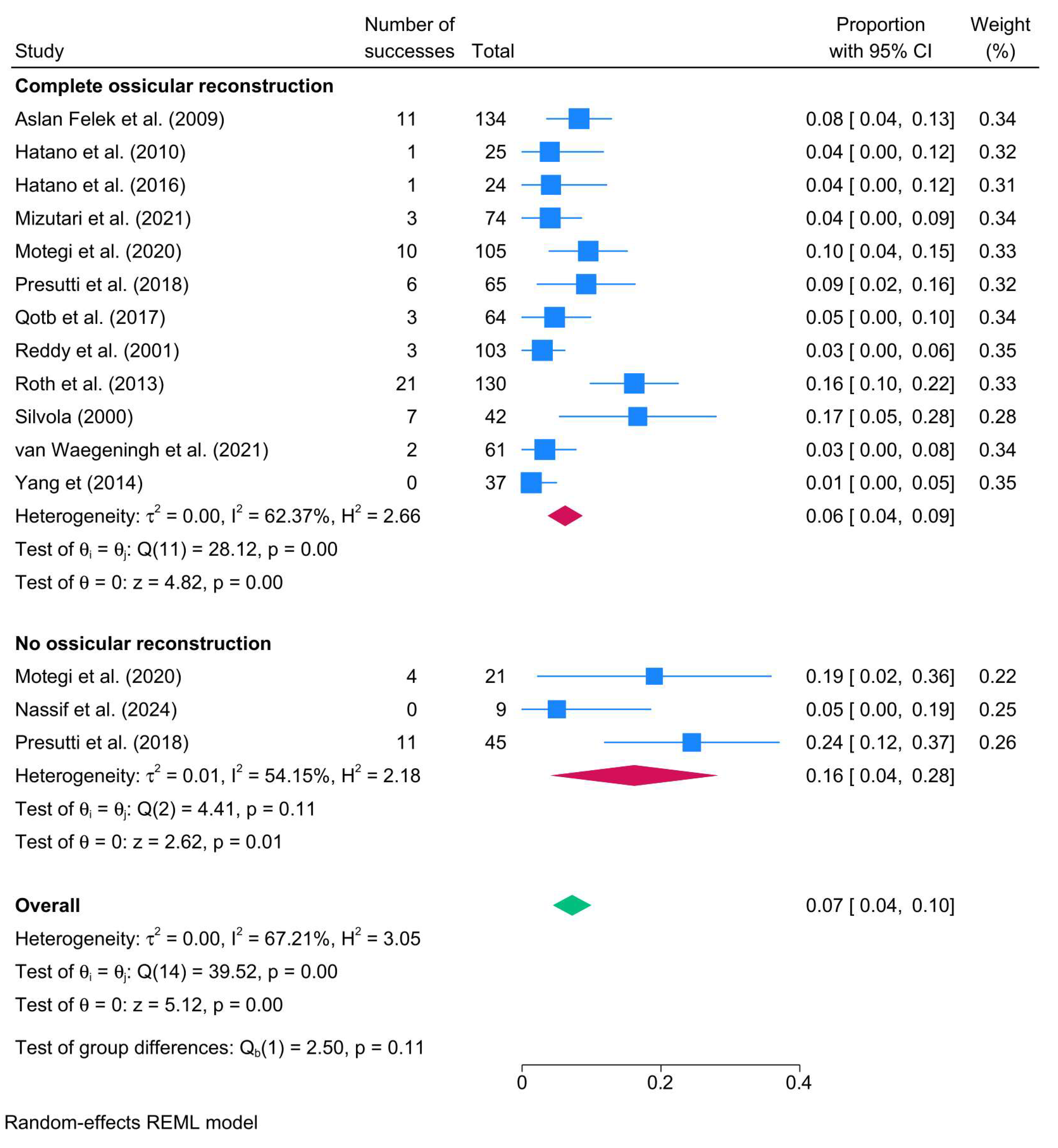 Ossicular reconstruction (per %) | 0.0012 | 0.0004 | 3.08 | 0.0020 | 0.0004 | 0.0019 | Omitted (due to collinearity) | |||||