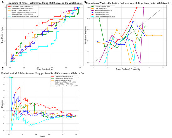 As illustrated in Figure 5A–C, the CatBoost model demonstrated the strongest discriminative ability among the six evaluated models, achieving an AUC of 0.6677. While this indicates modest predictive utility, it reflects the model’s capacity to stratify patients under evolving clinical conditions. The model further exhibited robust calibration (Brier score = 0.2276) and the highest precision–recall performance (Average Precision [AP] = 0.5985), underscoring its reliability in identifying true positive cases within the external cohort.