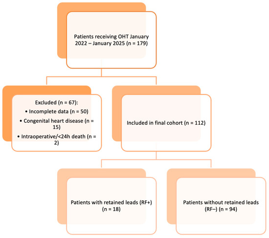 Flowchart of patient selection for orthotopic heart transplantation (OHT) between January 2022 and January 2025. Of 179 initial patients, 67 were excluded due to intraoperative death, death within 24 h, incomplete data, or congenital heart disease. The final cohort included 112 patients, subdivided into 18 with retained intracardiac leads (RF+) and 94 without retained leads (RF−).