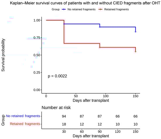Background/Objectives: Retained fragments of cardiovascular implantable electronic device (CIED) leads are frequently observed after orthotopic heart transplantation (OHT), but their clinical relevance remains unclear. Methods: We conducted a single-center, retrospective study of 179 adult patients who underwent OHT between January 2022 and January 2025. Post-transplant imaging was used to identify retained lead fragments. Patients were grouped based on the presence or absence of retained leads. The primary endpoint was all-cause mortality at 30, 90, and 150 days post-transplant. Survival analysis was performed using Kaplan–Meier estimates and Cox proportional hazards modeling. Results: Among 112 patients with pre-transplant CIEDs, 18 (16%) had retained intravascular lead fragments. These patients had significantly lower survival at 30 days (66.7% vs. 94.7%), 90 days (61.1% vs. 90.3%), and 150 days (55.0% vs. 83.5%) compared to those without retained fragments (log-rank p = 0.002). The presence of retained leads was independently associated with increased mortality (HR: 3.71; 95% CI: 1.55–8.84; p = 0.003), even after adjusting for potential confounders. Conclusions: Retained CIED lead fragments are independently associated with higher early post-transplant mortality. These findings support the need for individualized intraoperative strategies to mitigate hardware-related risks in high-risk transplant candidates.