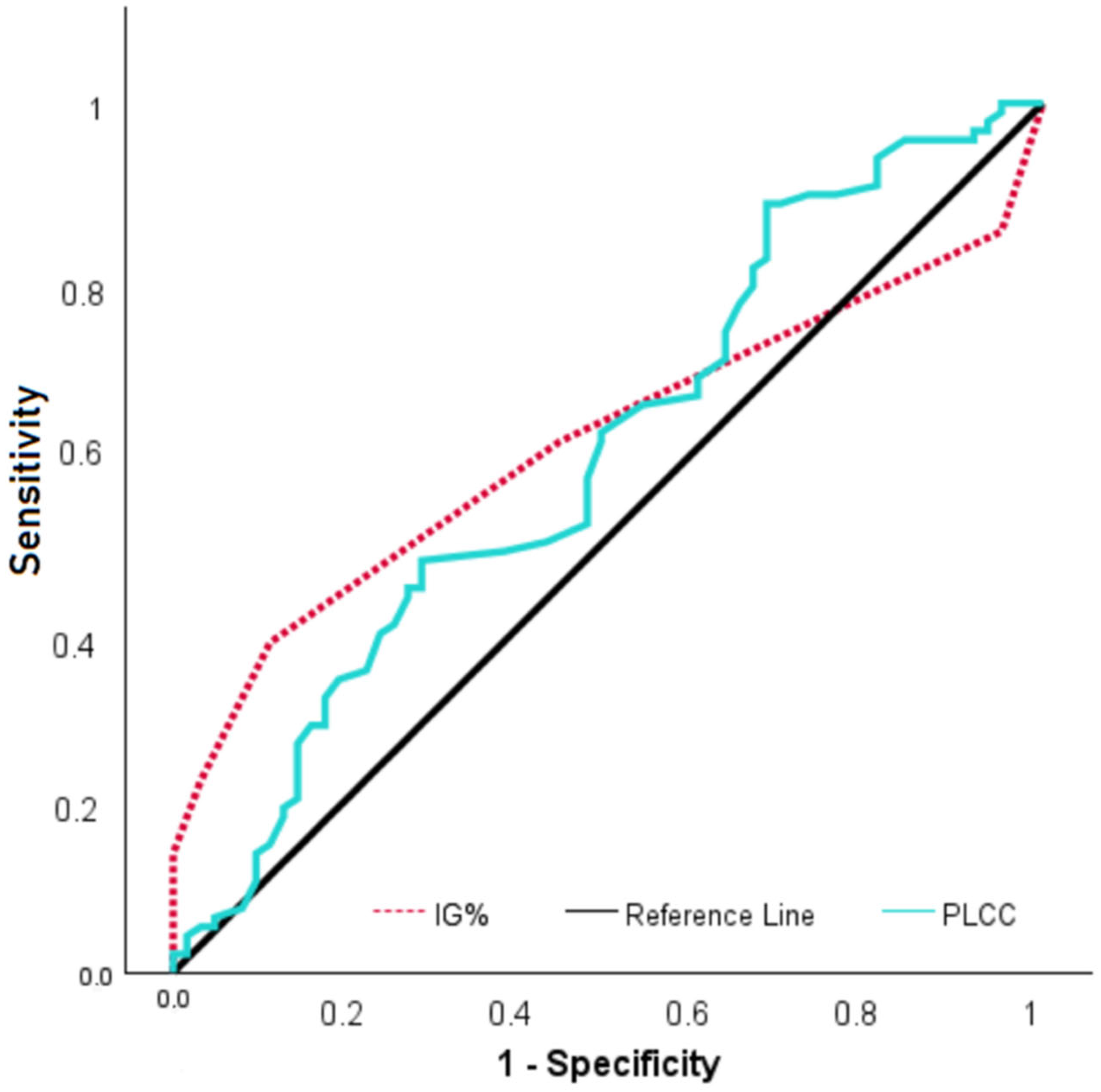 Figure 1. ROC curve of IG% and PLCC in FM patients.