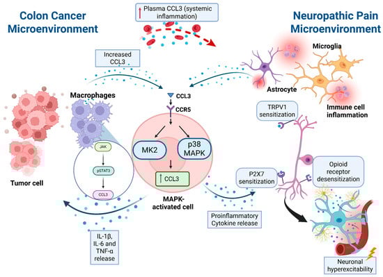 The studies of Phinney et al. [] and Kiguchi et al. [] also draw a possible link between colon cancer and CIPN, (at least partially) via CCL3. As already elaborated, tumor-cell-derived CCL3 activates the MAPK pathway, leading to the production of IL-1β, IL-6 and TNF-α. Kiguchi et al. shows that the macrophage-induced upregulation of CCL3 is driven by pSTAT3, which is activated by JAK, itself activated by various cytokines including IL-6. It is feasible that this upregulation of CCL3 in the spinal cord can lead to neuropathy or could drive its development. Therefore, the overlapping CCL3–CCR5–MAPK signaling axis may represent a mechanistic link between colorectal cancer progression and the development of chemotherapy-induced peripheral neuropathy. Figure 3 summarizes the proposed mechanisms by which CCL3 may contribute to both pathologies.