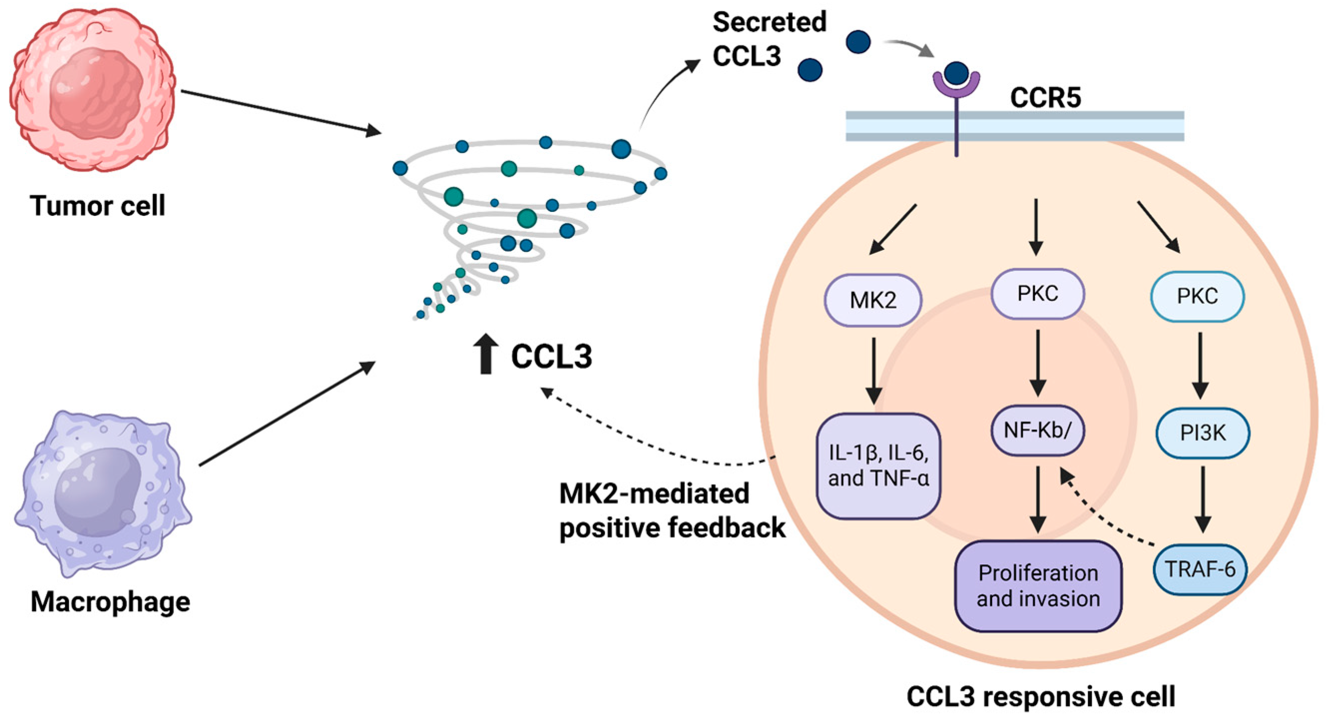 MAPK | Promotes tumor cell proliferation when activated in tumor cells and macrophages. | Activates microglia and astrocytes, leading to pro-inflammatory cytokine release and neuronal excitability. | CCL3 activates MAPK, creating a feedback loop that amplifies inflammation and pain sensitization |