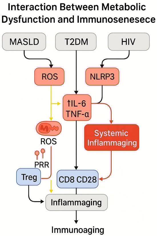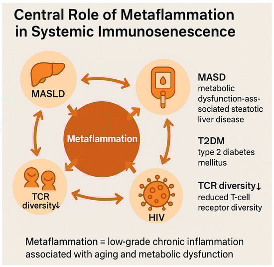 Metaflammation, defined as a chronic low-grade inflammatory state associated with nutritional excess and metabolic dysfunction, represents a common pathogenic denominator linking MASLD, type 2 diabetes mellitus (T2DM), and immunosenescence [].