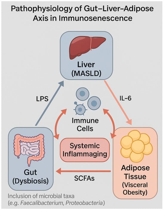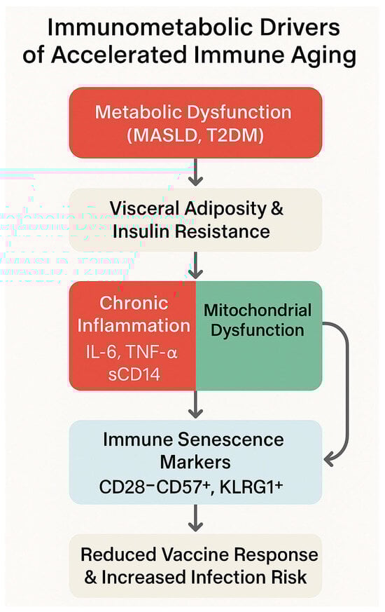 Metabolic dysfunction—which encompasses insulin resistance, visceral obesity, hepatic steatosis (MASLD), and type 2 diabetes—has emerged as a principal driver of early-onset immunosenescence []. Visceral adipose tissue functions as an immunoactive organ, promoting chronic inflammation through the infiltration of senescent cells and the secretion of pro-inflammatory mediators (IL-6, TNF-α, leptin), with consequent inflammasome activation, reactive oxygen species (ROS) production, and mitochondrial damage [].
