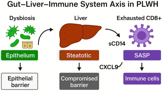In PLWH with MASLD, the gut–liver–immune axis appears profoundly disrupted, characterized by dysbiosis, impaired mucosal barrier integrity, chronic hepatic inflammation, and marked immunosenescence [,].