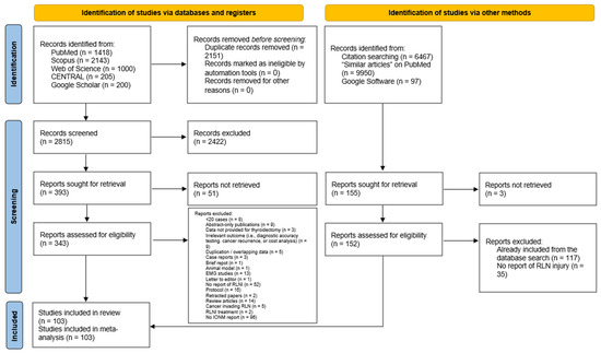 The literature search and screening process yielded 4966 citations, with 2151 duplicates identified using EndNote (Figure 1). After removing duplicates, 2815 articles remained, from which 2422 were excluded during title/abstract screening. We could not retrieve the full text for 51 articles, leaving 343 for full-text review. The corresponding/first authors of those papers were contacted three times through emails and ResearchGate; however, no response was received from them. A total of 144 articles were excluded during the full-text screening phase. In summary, the reasons included no report of IONM use (n = 96), followed by no reporting of RLNI (n = 52), protocols (n = 16), review articles (n = 14), EMG studies (n = 13), irrelevant outcome data (n = 9), and abstract-only publications (n = 9). The manual search of 16,514 articles yielded 155 papers, of which 152 were screened with no additional articles being identified. Finally, 103 studies were deemed eligible for data synthesis [6,21,22,23,24,25,26,27,28,29,30,31,32,33,34,35,36,37,38,39,40,41,42,43,44,45,46,47,48,49,50,51,52,53,54,55,56,57,58,59,60,61,62,63,64,65,66,67,68,69,70,71,72,73,74,75,76,77,78,79,80,81,82,83,84,85,86,87,88,89,90,91,92,93,94,95,96,97,98,99,100,101,102,103,104,105,106,107,108,109,110,111,112,113,114,115,116,117,118,119,120,121,122].