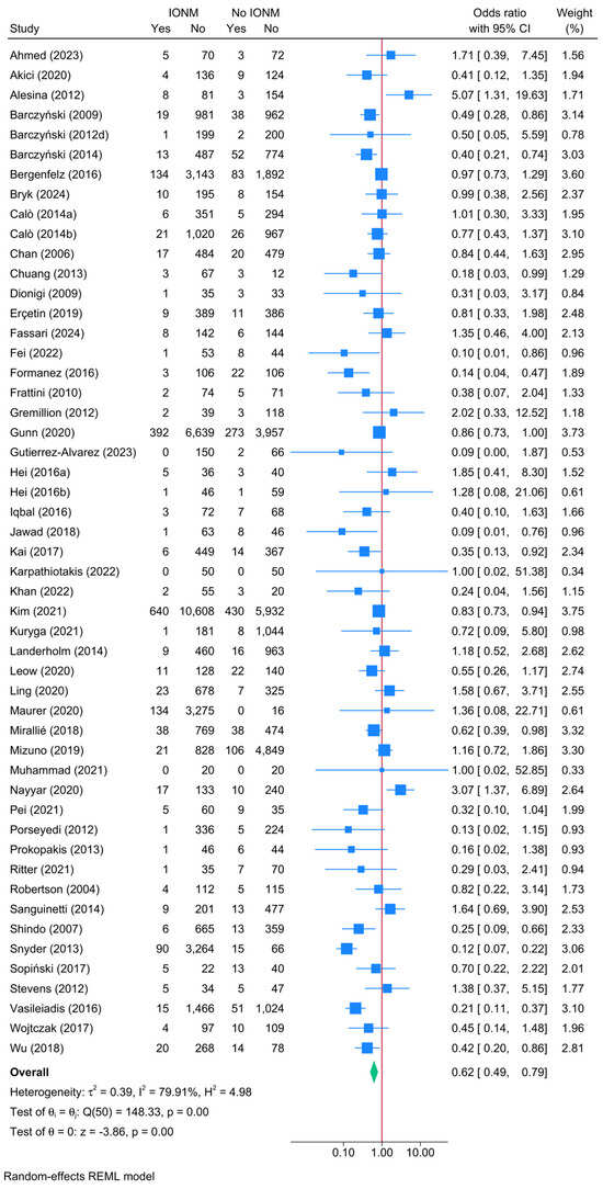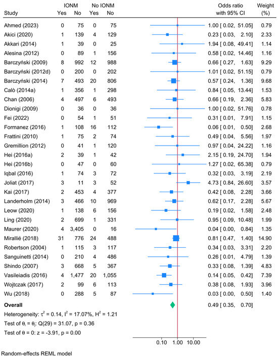 Forest plot showing the risk of unilateral permanent RLNI in studies reporting direct head-to-head comparison between IONM and no-IONM [23,24,25,26,33,36,37,43,44,50,55,56,57,58,63,64,66,68,70,74,76,77,84,86,101,104,108,114,116,118].