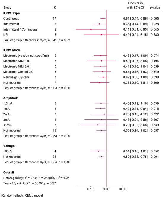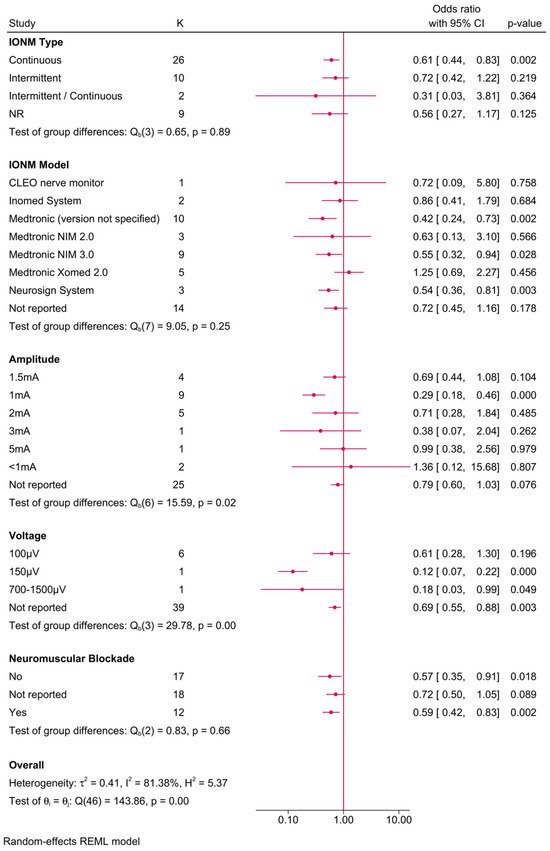 Further subgroup analysis was performed to examine the impact of different IONM parameters on the protective effect (Figure 5). The benefit of IONM was observed across various subgroups, with continuous IONM showing an OR of 0.61 (95% CI: 0.44–0.86), while intermittent IONM exhibited an even lower OR of 0.35 (95% CI: 0.14–0.89). Among IONM models, Medtronic NIM 2.0 provided the greatest risk reduction (OR = 0.41, 95% CI: 0.16–1.04), followed by the Medtronic Xomed 2.0 system (OR = 0.55, 95% CI: 0.16–1.93). However, subgroup comparisons did not yield statistically significant differences (p-values > 0.05), suggesting that the protective effect of IONM was largely consistent across different models and settings. Stimulation amplitude analysis revealed that lower amplitudes (≤2 mA) were associated with a greater protective effect, while amplitudes > 3 mA exhibited weaker risk reduction. Additionally, voltage did not appear to significantly modify the effect size.